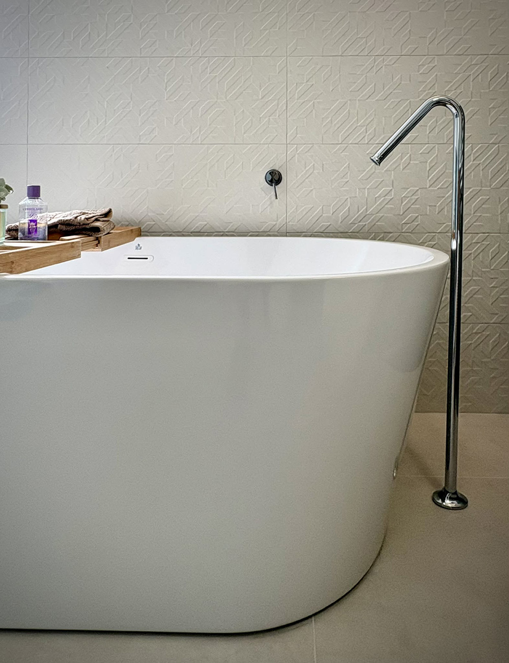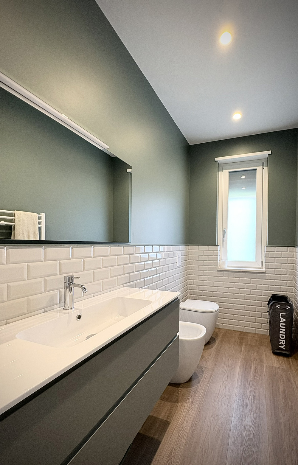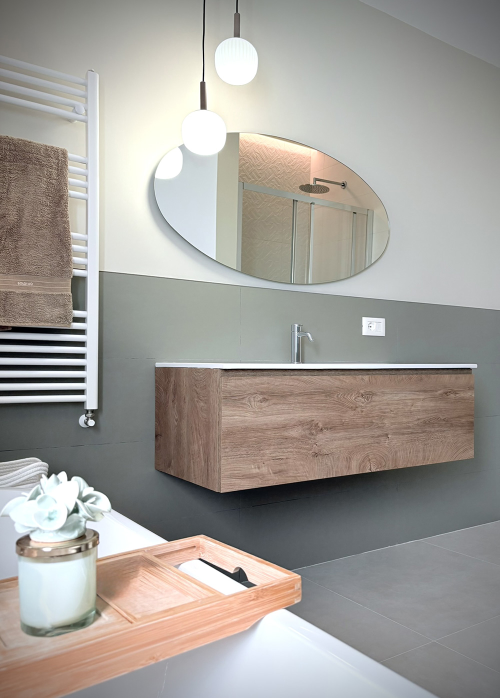 I bagni sono concepiti come luoghi del benessere, in cui le linee pulite e le superfici dialogano con la luce indiretta, creando atmosfere soffuse e avvolgenti.