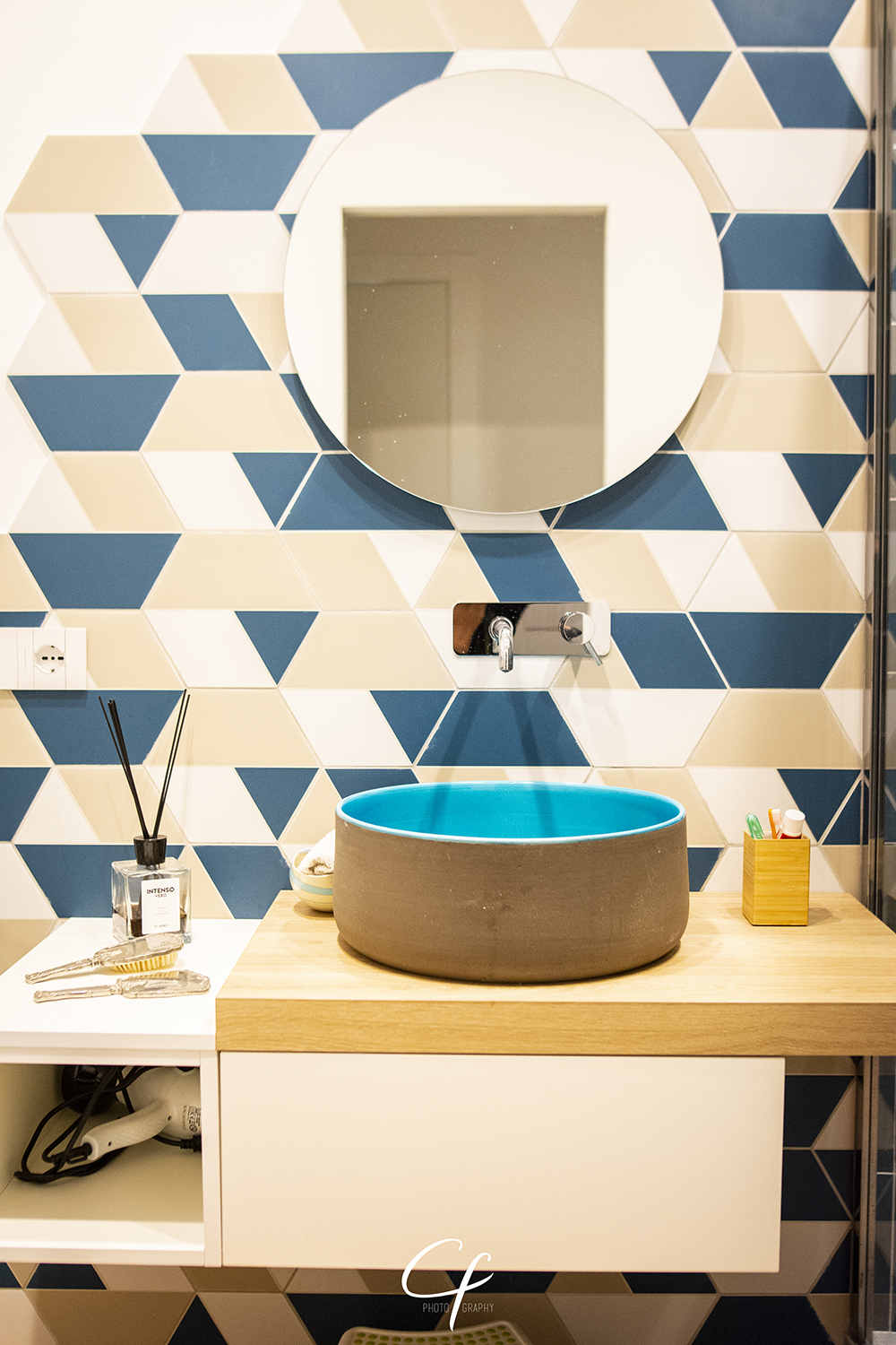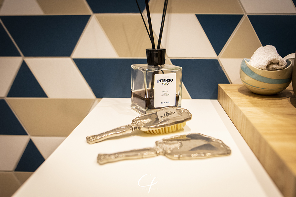 Il primo, di piccole dimensioni, è caratterizzato da una grande doccia rettangolare con un rivestimento della collezione Lume di Marazzi. L’utilizzo di piastrelle esagonali Ornamenta ha consentito di creare uno spazio armonico e di aumentare, con un brillante effetto ottico, il volume del bagno. L’elemento più caratterizzante di questo ambiente è tuttavia il lavabo Cipì Bathroom, prodotto semiartigianale con l’interno smaltato in turchese e l’esterno in argilla.