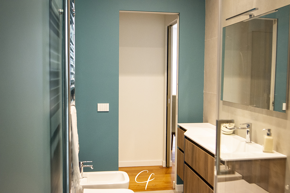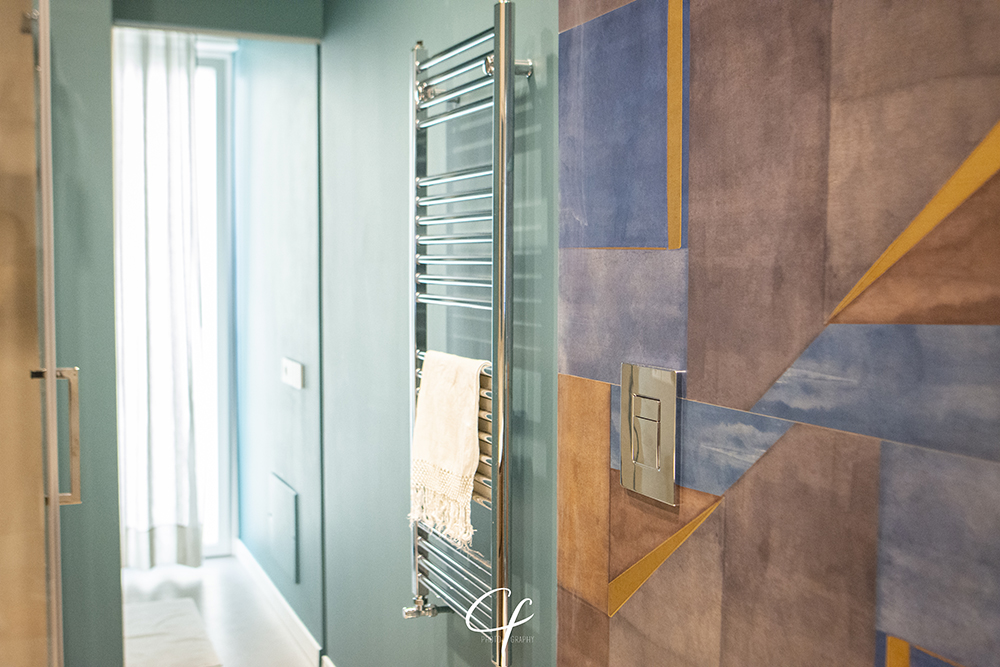 Il secondo bagno, stretto e lungo, è dotato di un mobile a cambio profondità e caratterizzato da una piastrella decorativa di grande formato, in nuance di colore che vanno dal grigio al blu, fino al vinaccia. Le pareti sono state rifinite in microresina, e il colore è stato armonizzato con quello della mattonella decorata.