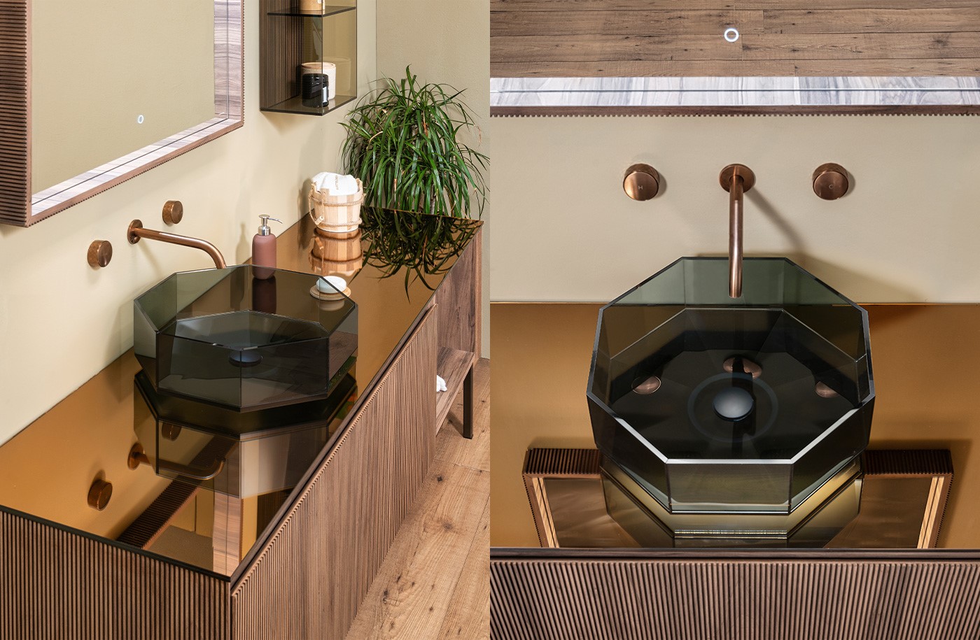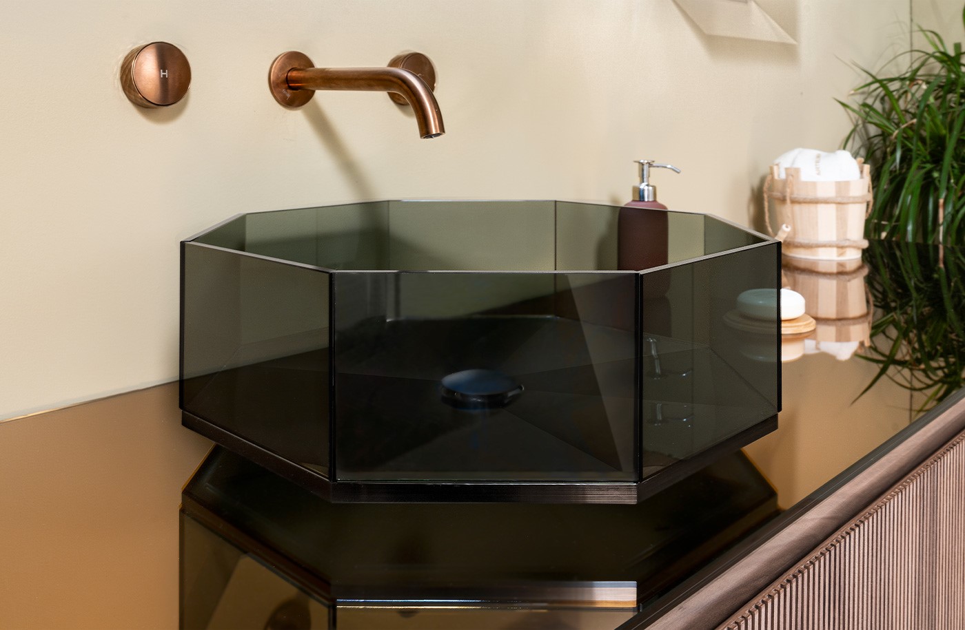 Il lavabo è composto da otto lati uguali incollati sapientemente tra loro e al bacino, bordi netti che creano un effetto architettonico.