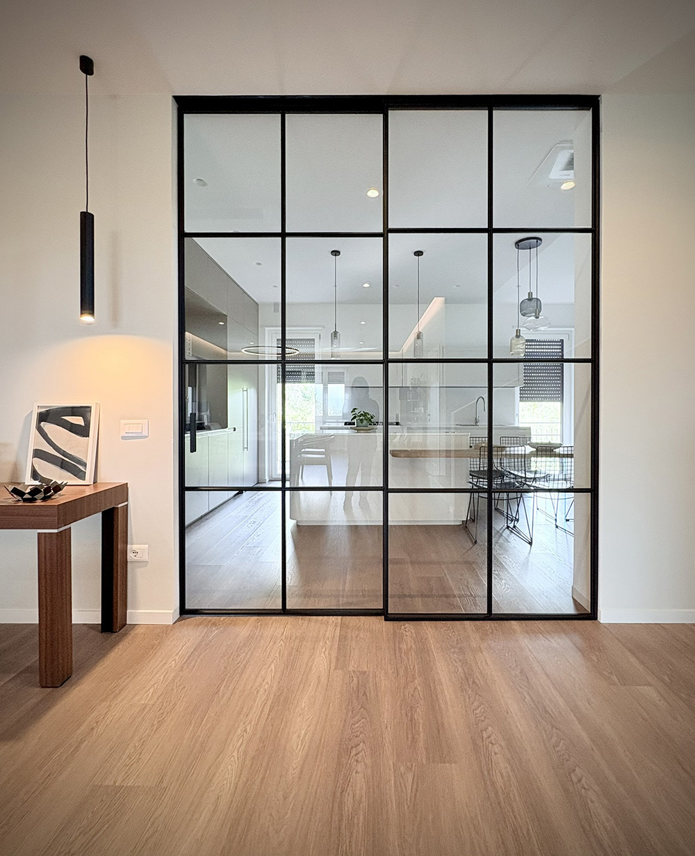 Il disegno a riquadri richiama un’estetica industriale reinterpretata in chiave elegante, mentre la trasparenza del vetro permette alla luce naturale di attraversare lo spazio, amplificandone profondità e luminosità.