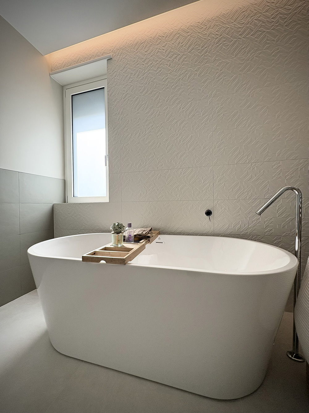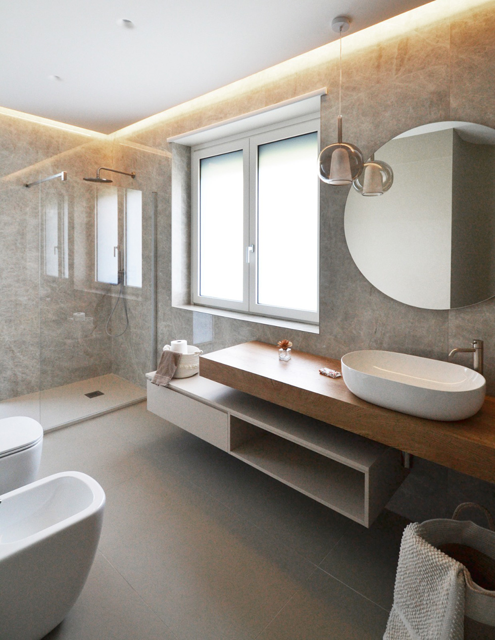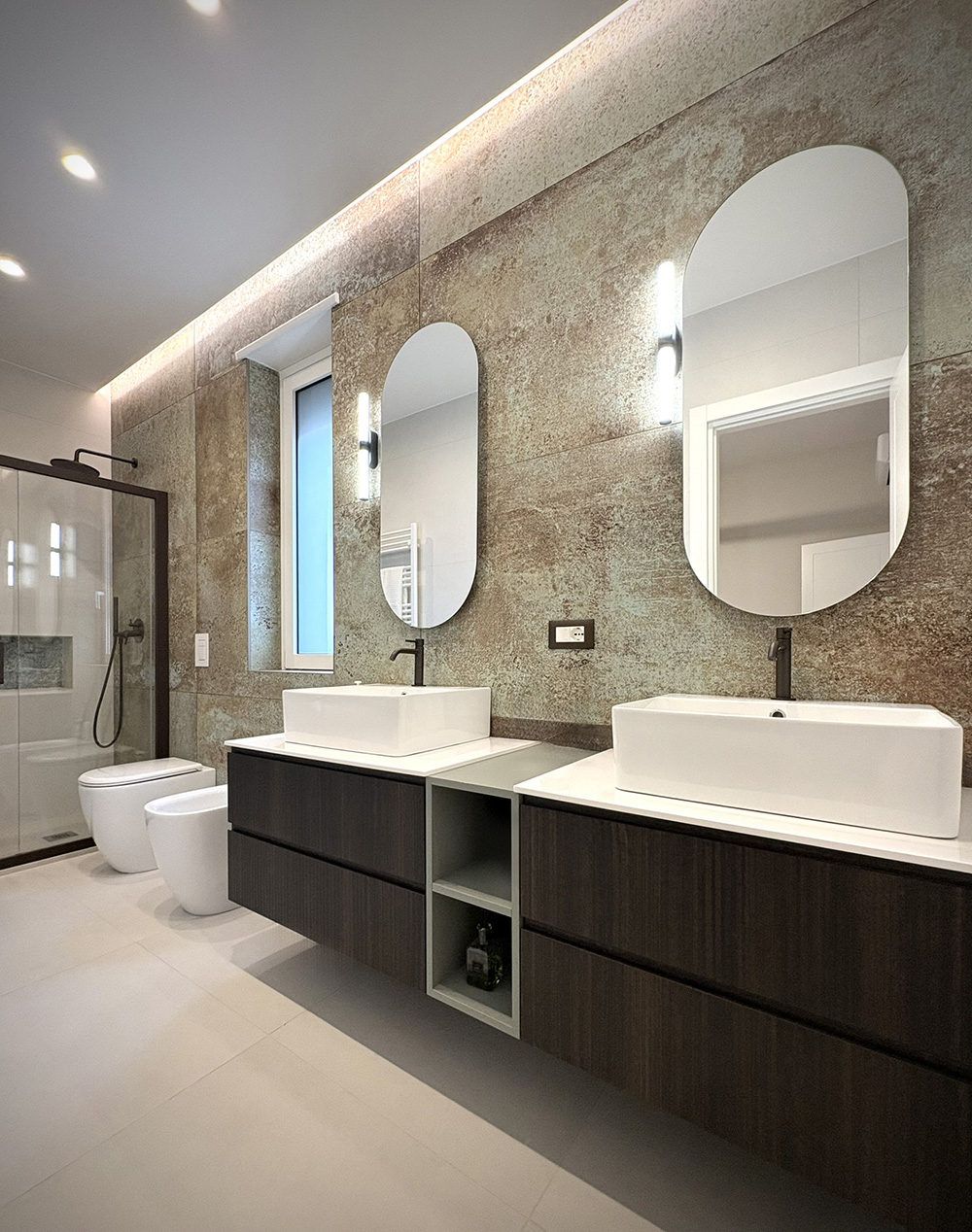 I bagni sono concepiti come luoghi del benessere, in cui le linee pulite e le superfici dialogano con la luce indiretta, creando atmosfere soffuse e avvolgenti.