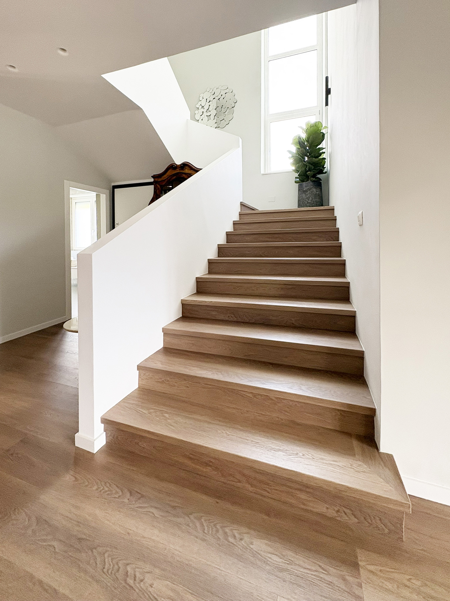 Il pavimento Déco Clap, posato anche sulla scala a copertura di un vecchio marmo, crea continuità tra i diversi ambienti e, nella colorazione “Rub”, fornisce una base calda e neutra per l’arredamento.
